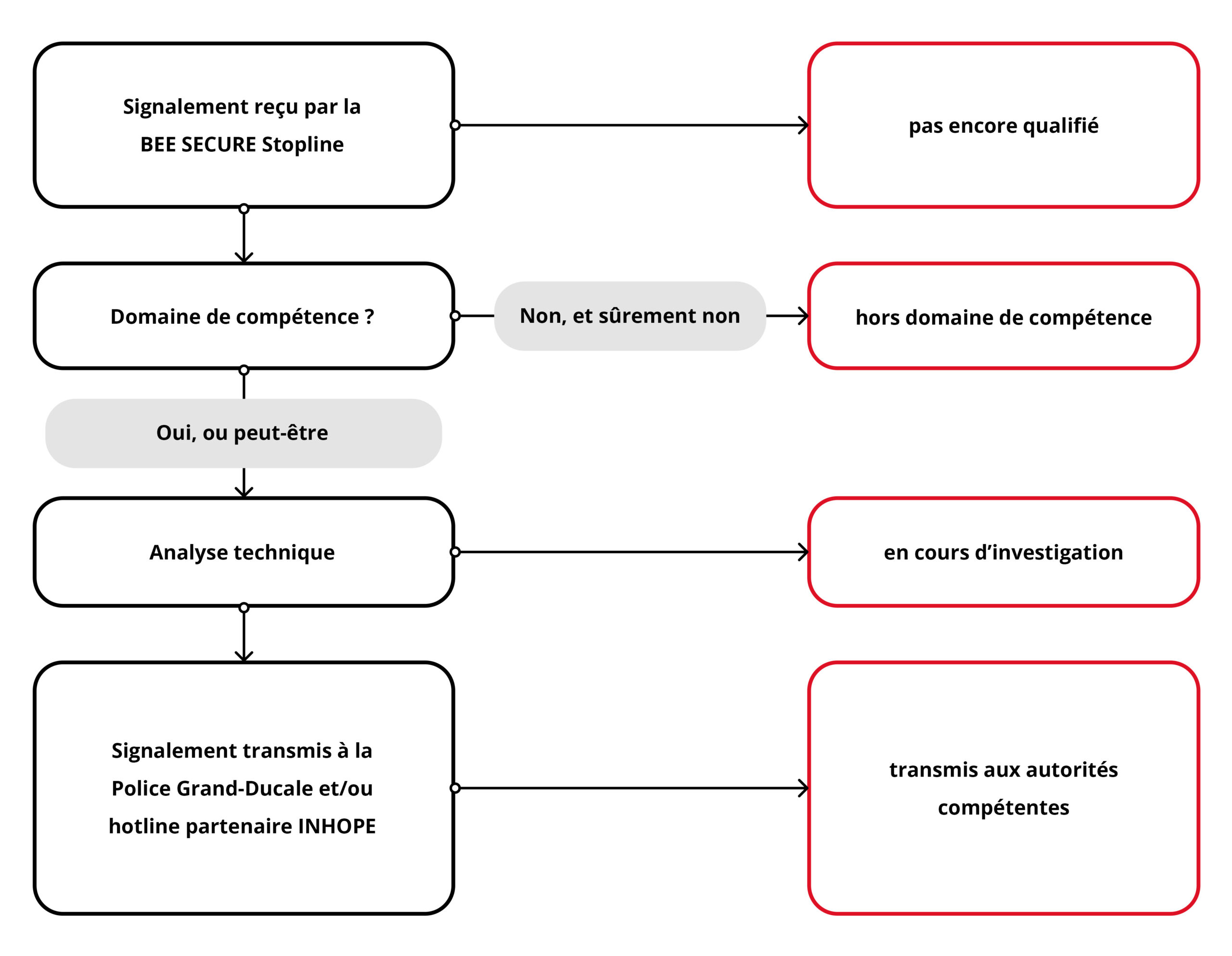 Suite à cette analyse technique, les informations relatives au contenu illégal signalé sont transférées aux services adéquats de la Police Grand-Ducale, conformément à l’accord de collaboration entre le Kanner-Jugendtelefon, le Service National de la Jeunesse et la Police Grand-Ducale et les procédures opérationnelles de la BEE SECURE Stopline. Lorsque le contenu est hébergé dans un pays disposant d’une hotline partenaire membre d’INHOPE – International Association of Internet Hotlines, les informations relatives au contenu illégal sont également transférées à la hotline partenaire.